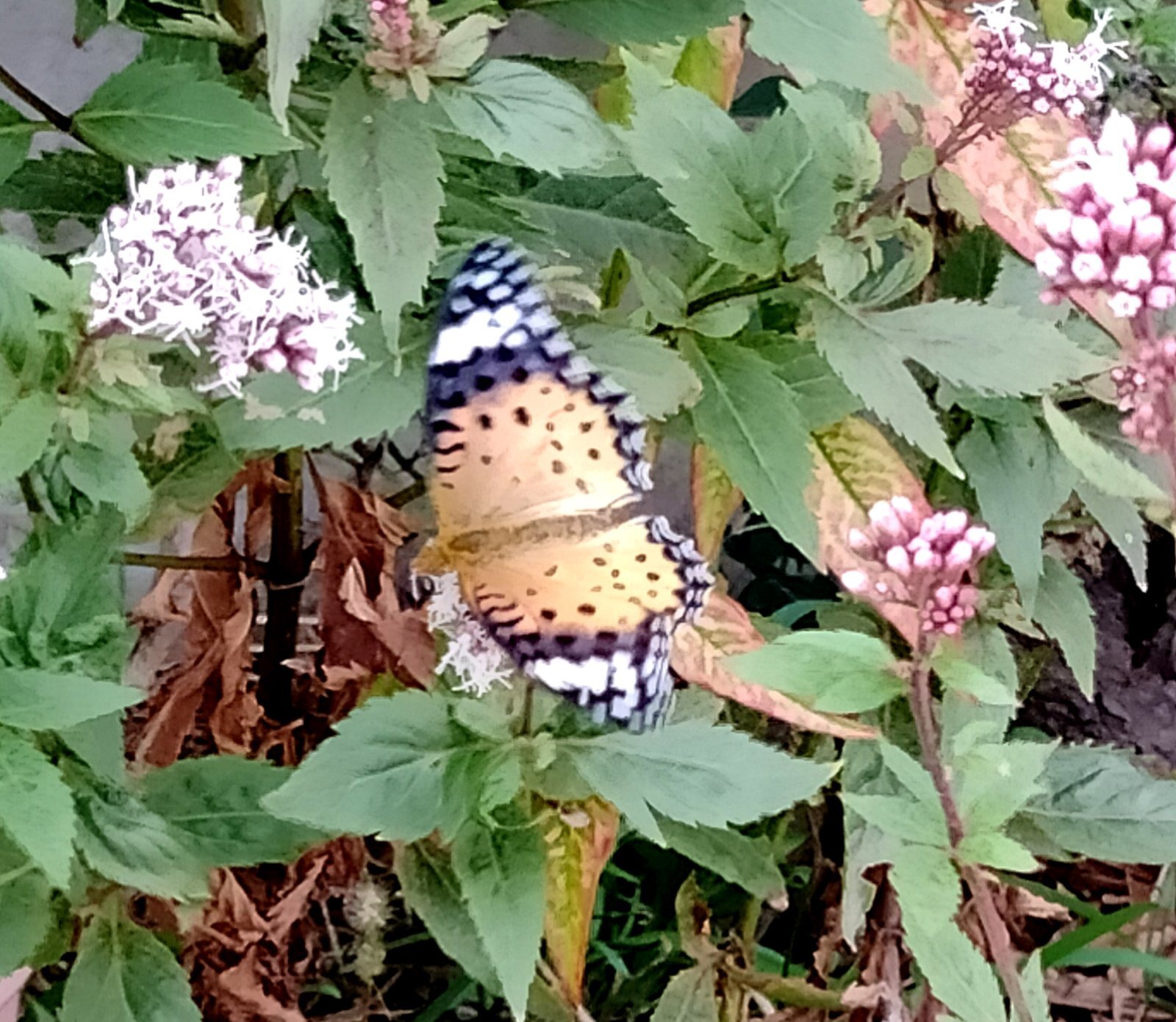 店長のお散歩日記 ◎爽やかな秋風に乗って『ツマグロヒョウモン』⇔わがやの花壇に。 2025年11月02日 ガレージ店でお勤めを終えた花(名前は忘れてます。非情な爺さん)の小さな花の上に。 外は金木犀の香いっぱいです!