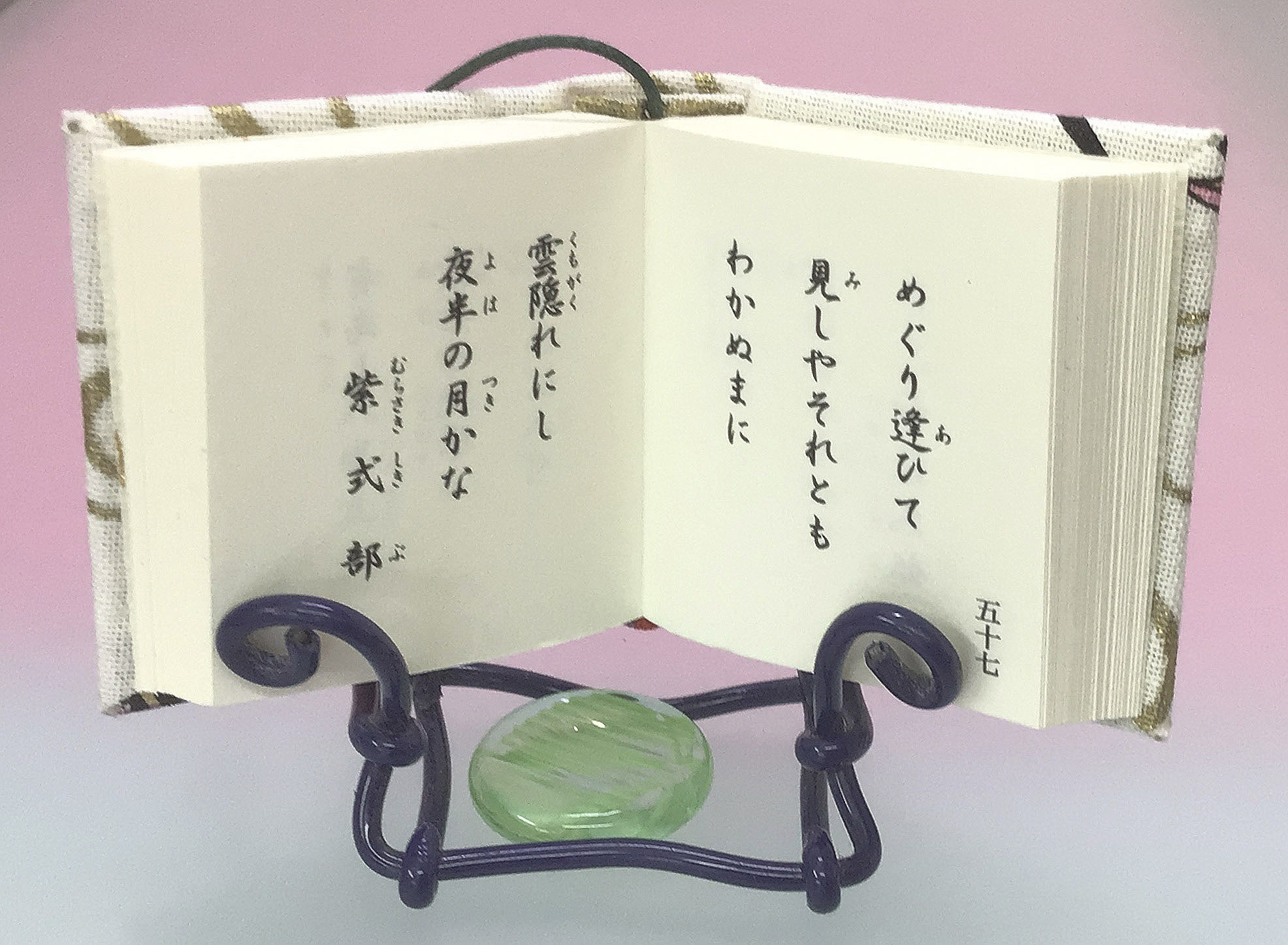 店長のお散歩日記 ◎ちはやふる「小倉百人一首」豆本*紫式部*箱付き*4×4,5㎝×200頁*上製本仕上げ 2025年11月01日 色違いですが箱を作ってみました(まだまだ 『びんてまり』には及びません) 珍しくぴったりと合う箱ができました(笑) 本文の活字見本です(見本用からです) 海文舎の無人ガレージ店に「小倉百人一首」豆本の小学生コーナーを設けました。 このコーナーに気付かれた方はお徳です。