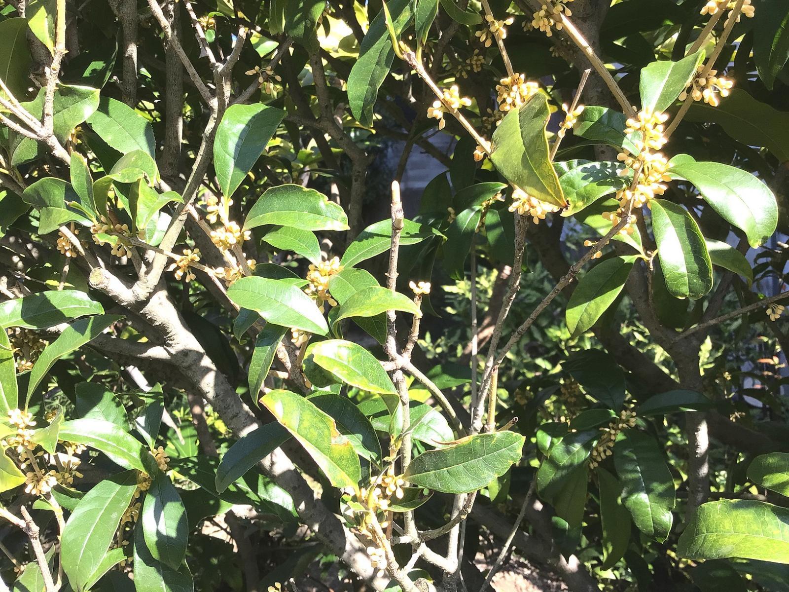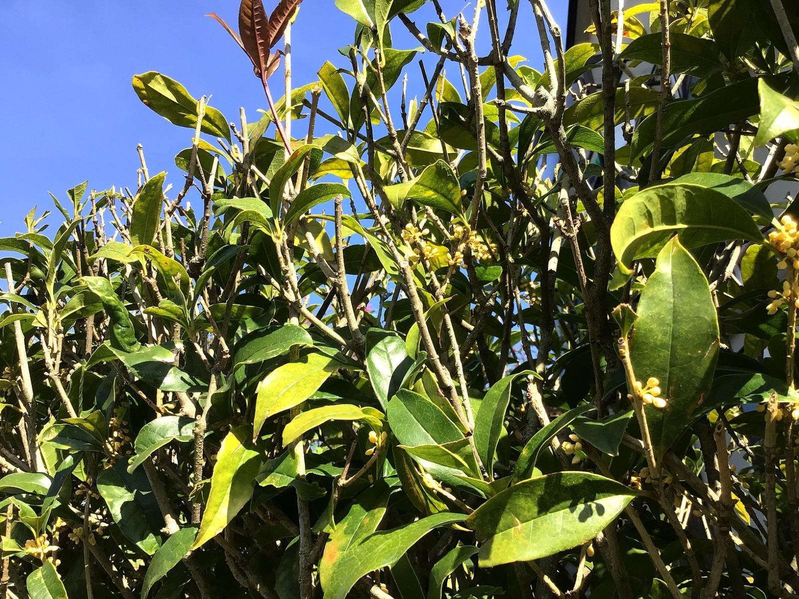 店長のお散歩日記 ◎◎金木犀と海文舎の無人ガレージ店の10月30日 2025年10月30日 お隣さんの丹精に刈り込められた「金木犀」の木から、ぼつぼつと小さな黄色い花が咲き出しました。 昨日は気がつきませんでした、 金木犀はいつもこうなんです。 やっと秋を感じますね。 昨晩の冷え込みで咲いたのかも。。。。 今日30日の「無人ガレージ豆本売り場」です。 お天気が良すぎて、立ち寄ってくださる方は少ないでしょう?