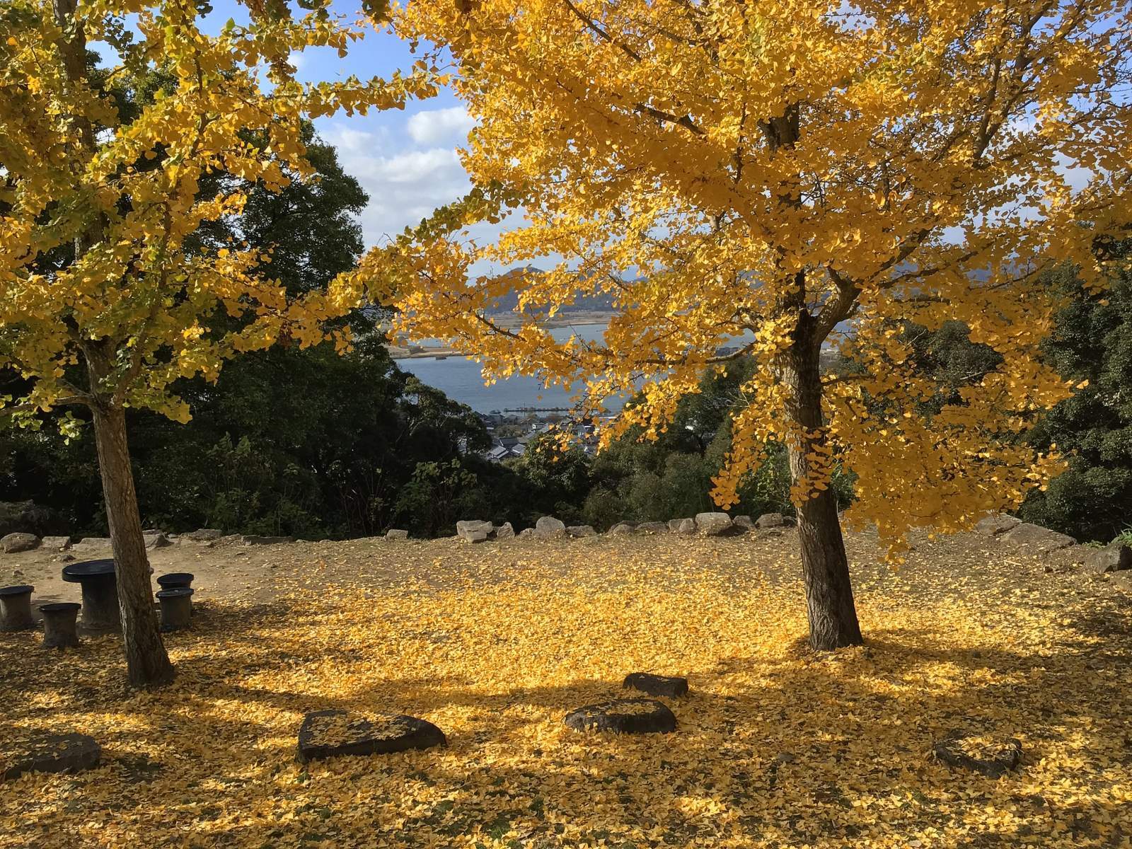 三重塔の横の銀杏が綺麗でした。その先に「小中湖」が、その先の先には琵琶湖が。