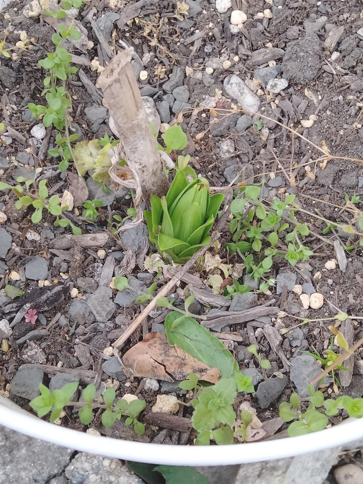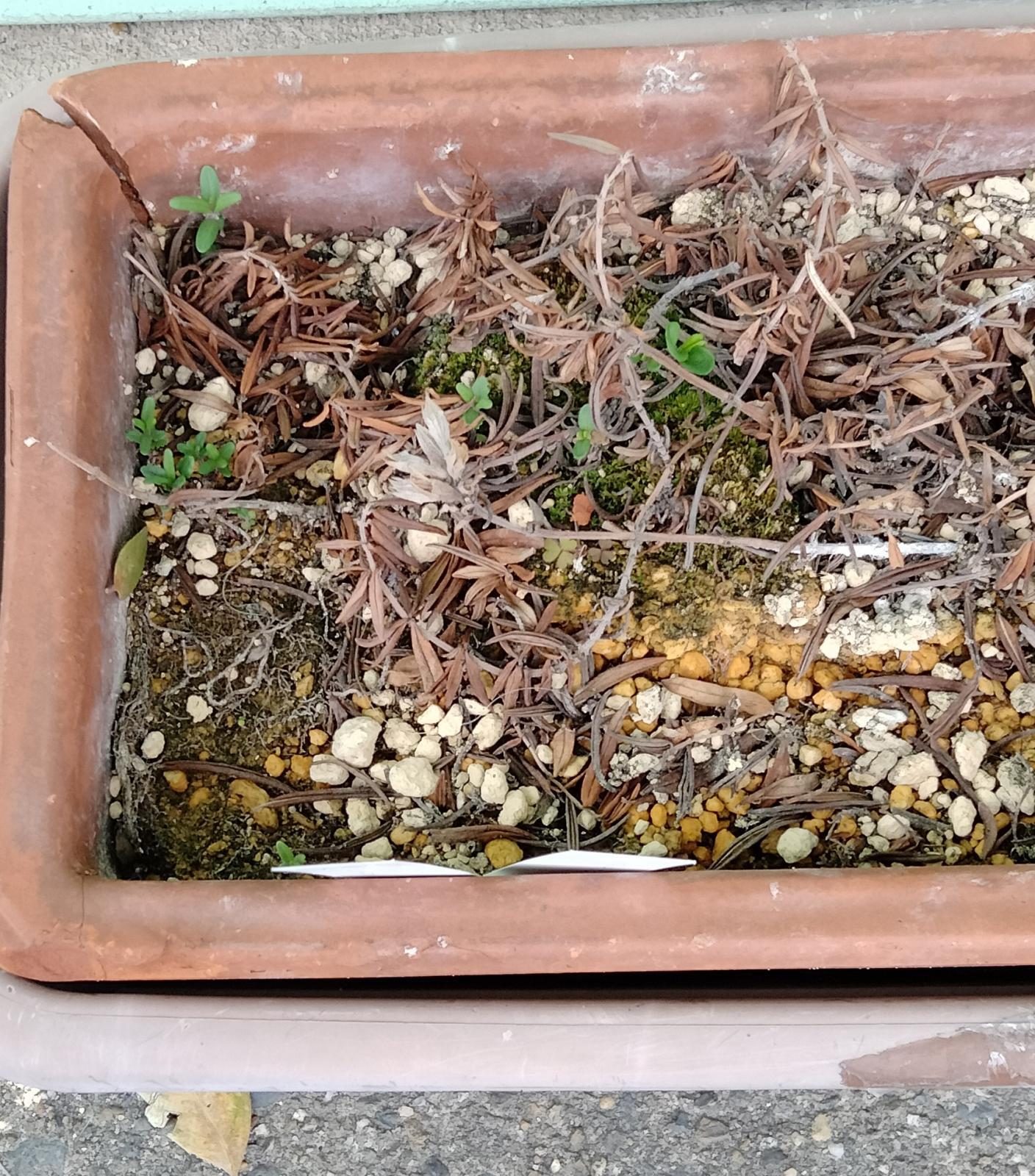 ムシャリンドウ です。寒い冬の夜はガレージ店に入れてます。若みどりの芽が見えますか?