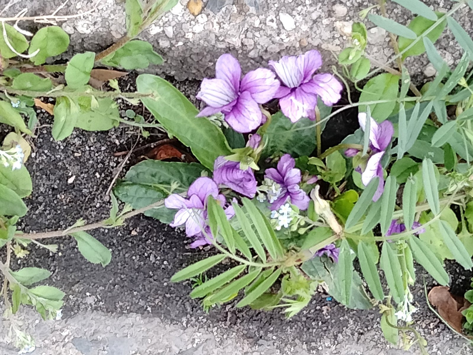 縁石スミレが、昨夜からの雨でお化粧直して通行人にアピールしてますが。。。それ以上目立つと踏まれちゃうよ。