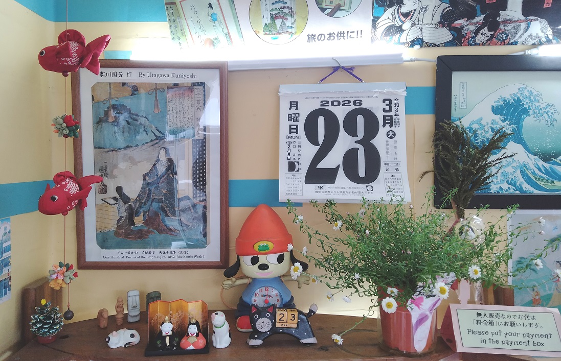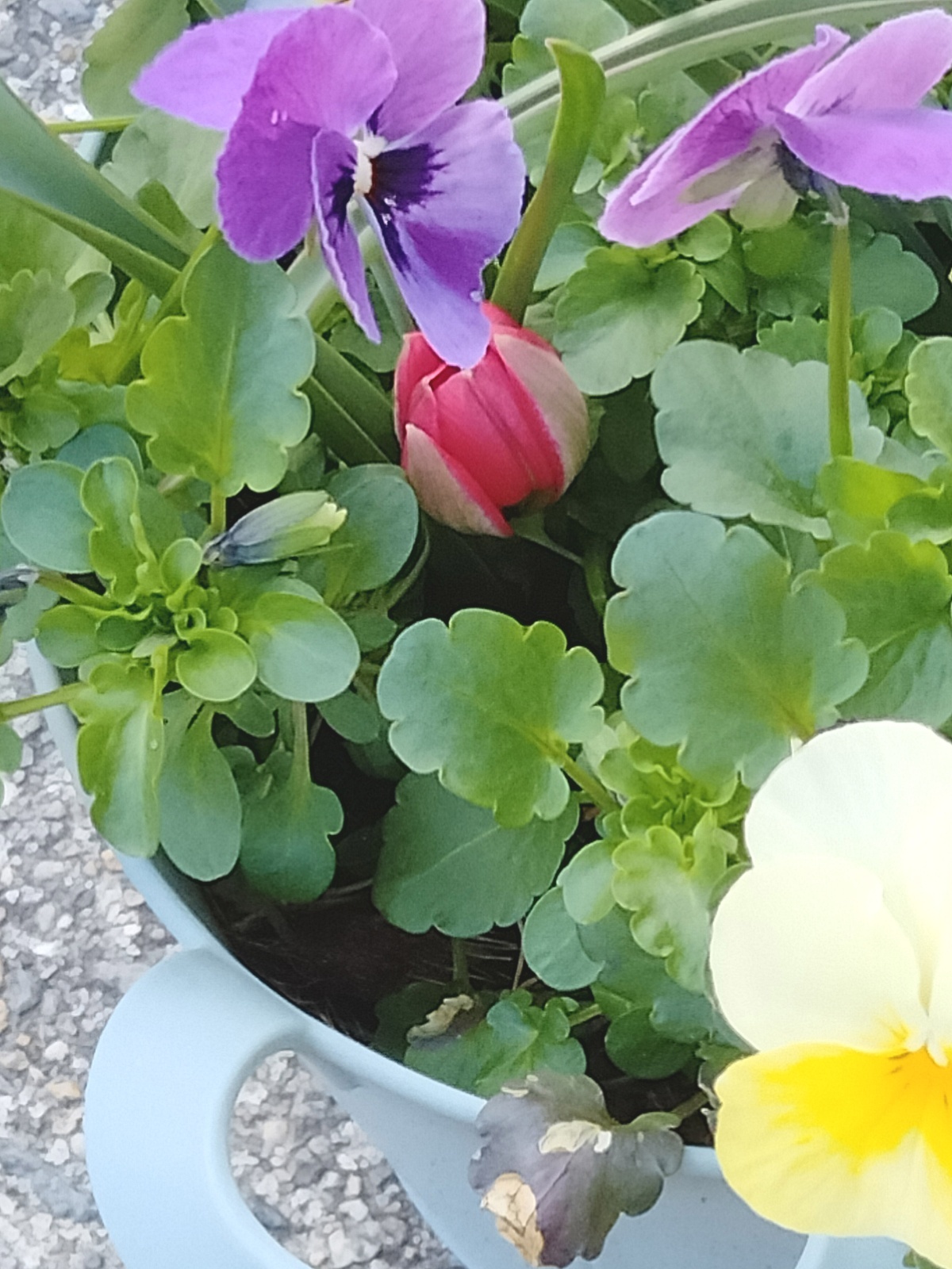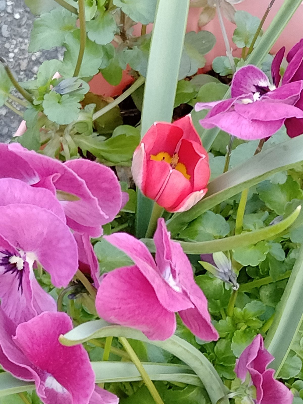 ◎◎3色スミレの間から チューリップが顔を覗かせました。海文舎無人ガレージ豆本店