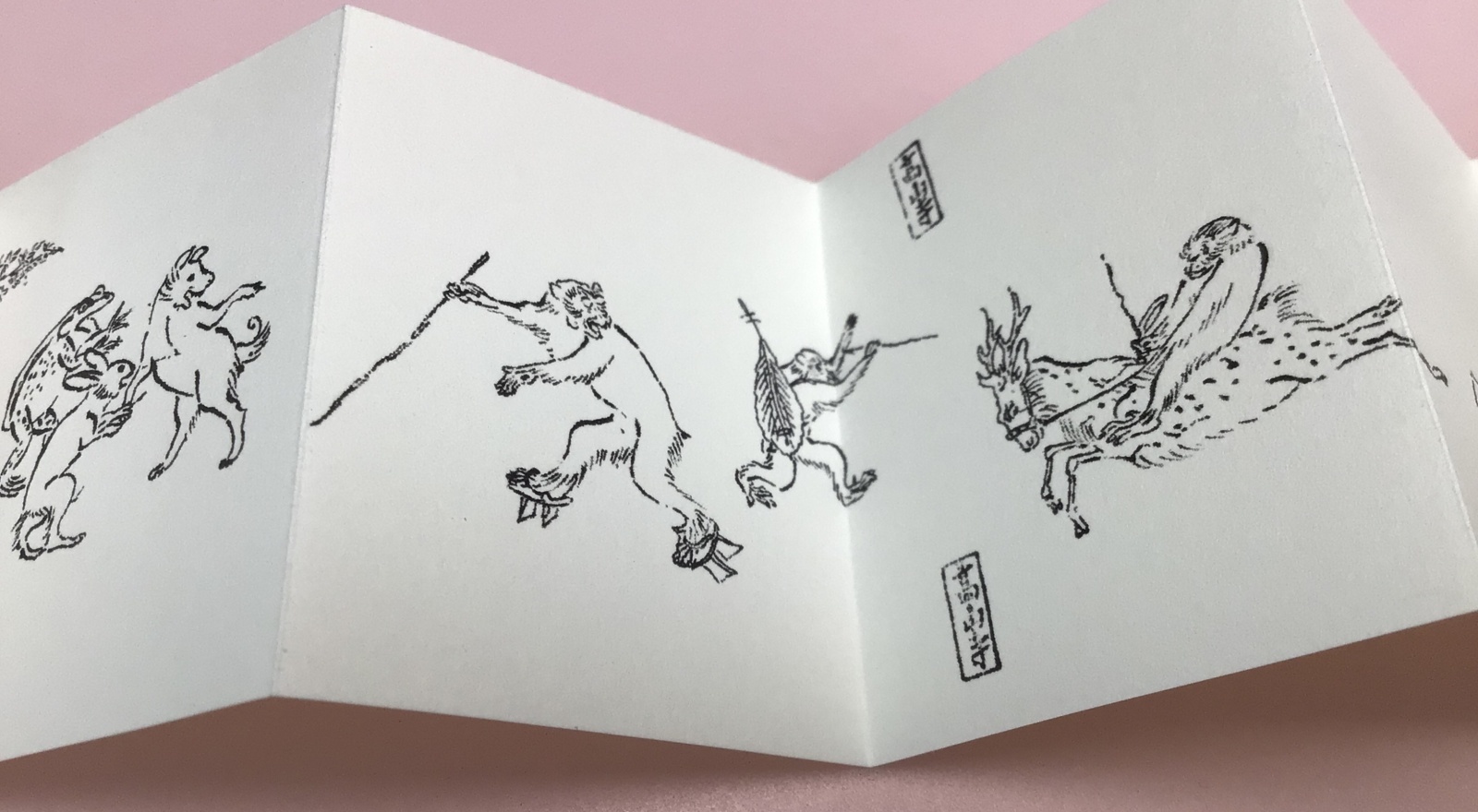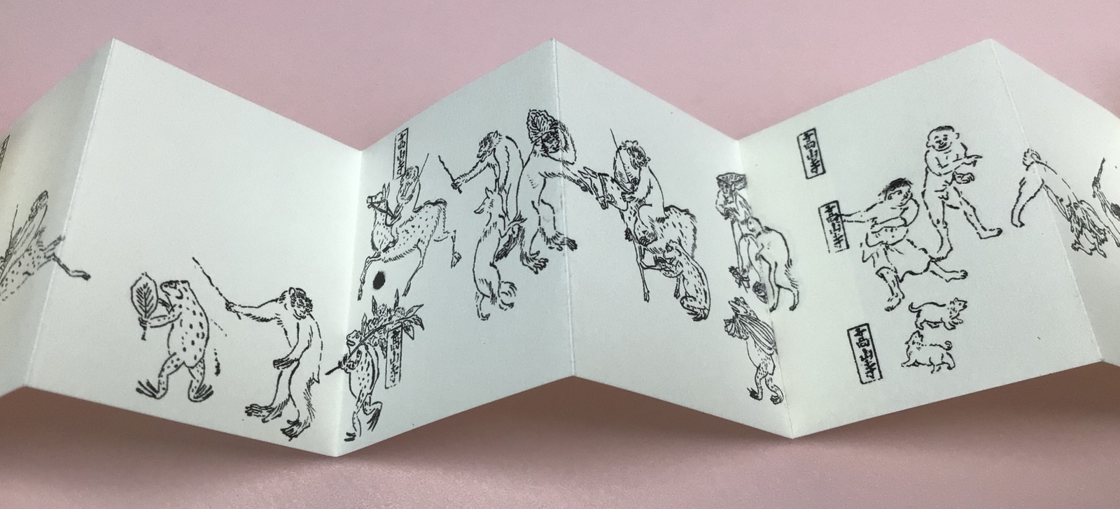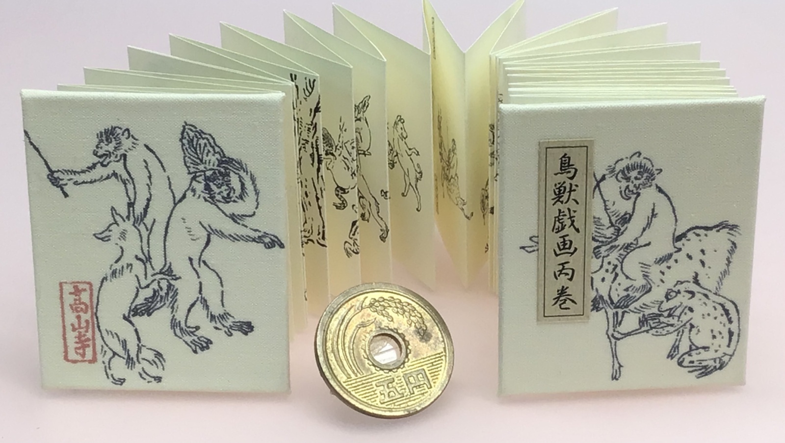 店長のお散歩日記 『鳥獣戯画・丙巻』蛇腹折り豆本⇔『この蹄鉄では有馬記念は駄目ですね!』 ⇔1面3,5cm×4cm×42面⇔1m23㎝・京都・海文舎の手仕事 2025年12月20日 お客様!この蹄鉄では「有馬記念の2500m」は。。。無理ですね! あいつ、直前で蹄鉄甲巻してるぜ! 走る気らしいぞ! おおお~~見ろ!見ろ!!あいつ大穴あけるかもしれないぞ!!??