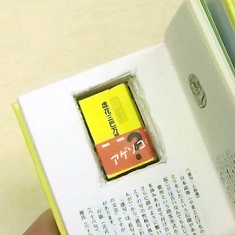この本は、いわゆる仕掛け本のひとつ、匚(かくし)文庫を構築したものです。本の一部をくり抜きヒミツの隠し場所にする、聖書の中に糸鋸の歯を潜めて脱獄する死刑囚の話を聞いたことがあると思いますが、その仕掛けを仕込んである本です。親亀、小亀、孫亀の三代の「本」を仲良く一冊に。