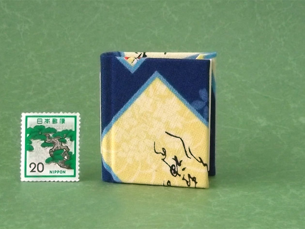 ミニサイズ(4.5cm×4cm)の手作り小倉百人一首豆本【丸背】です。